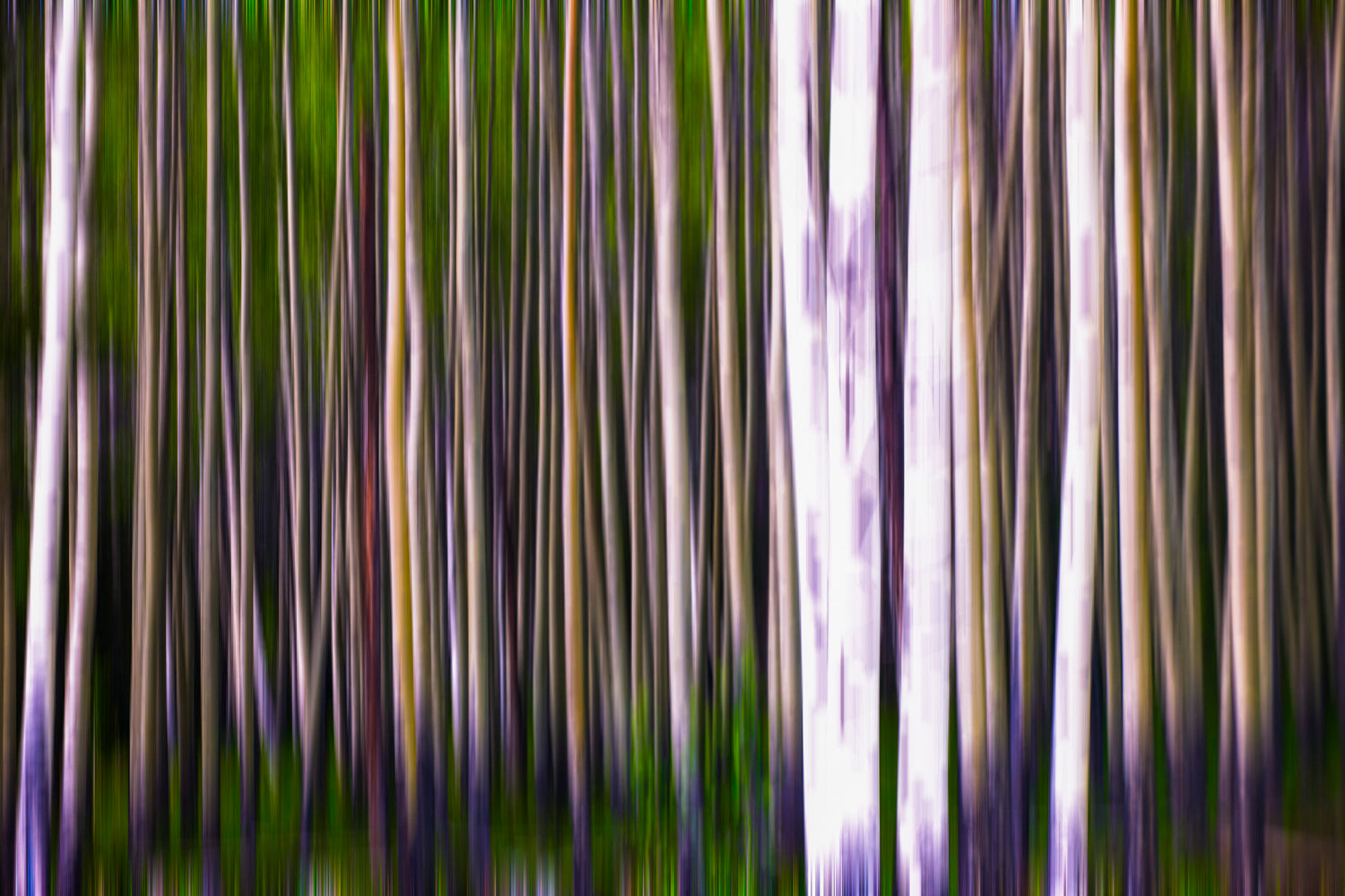 An artistic interpretation of a birch forest captured with intentional motion blur, creating a dreamlike fusion of vertical lines in shades of white, violet, and green. This visually dynamic piece evokes a sense of movement and mystery, making it an eye-catching accent for modern interiors or creative workspaces.