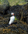 A charming Atlantic puffin standing proudly among seaweed covered rocks. The puffin's bright orange beak and vivid white plumage bring a splash of color to this natural coastal scene, perfect for adding a playful and fresh touch to any decor.