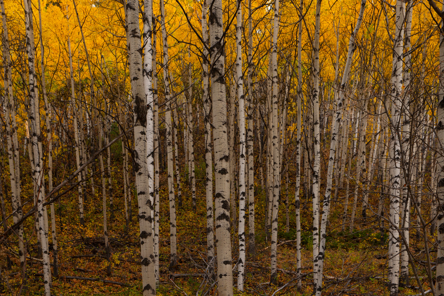A serene image of a dense birch forest captured in autumn. The slender white trunks stand tall among rich golden foliage, creating a peaceful and natural atmosphere.