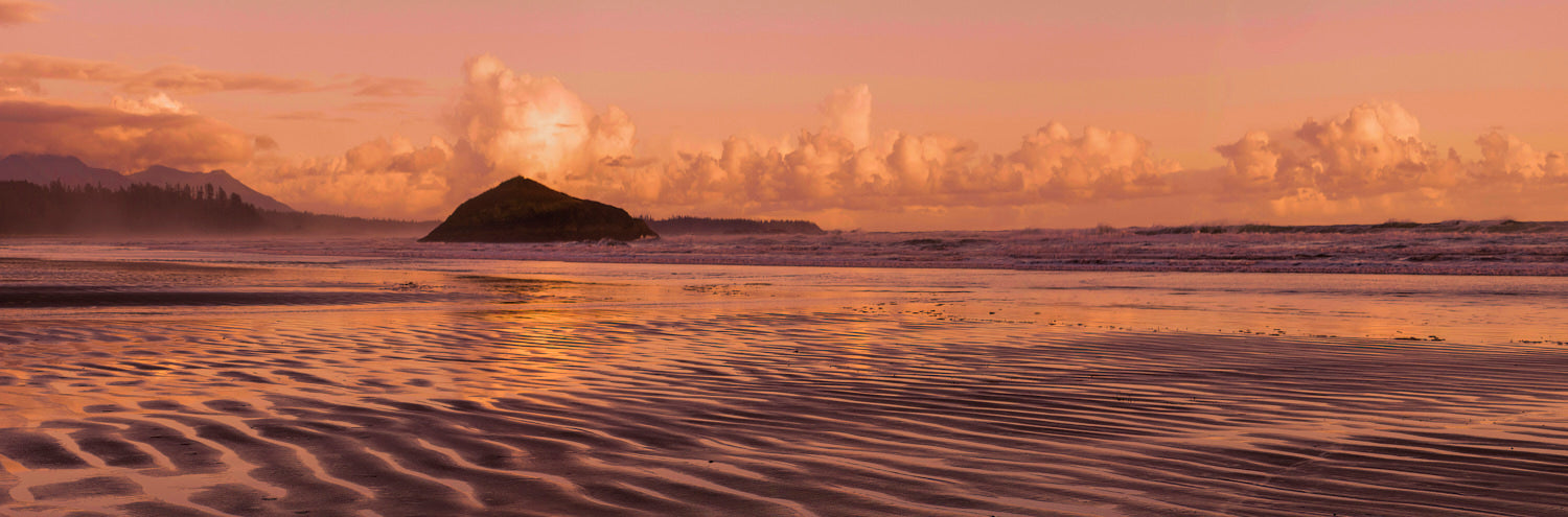 The shoreline glows under a coral sky, with soft ripples catching the last light of day. A quiet island anchors the horizon as the sea reflects the warmth of sunset.