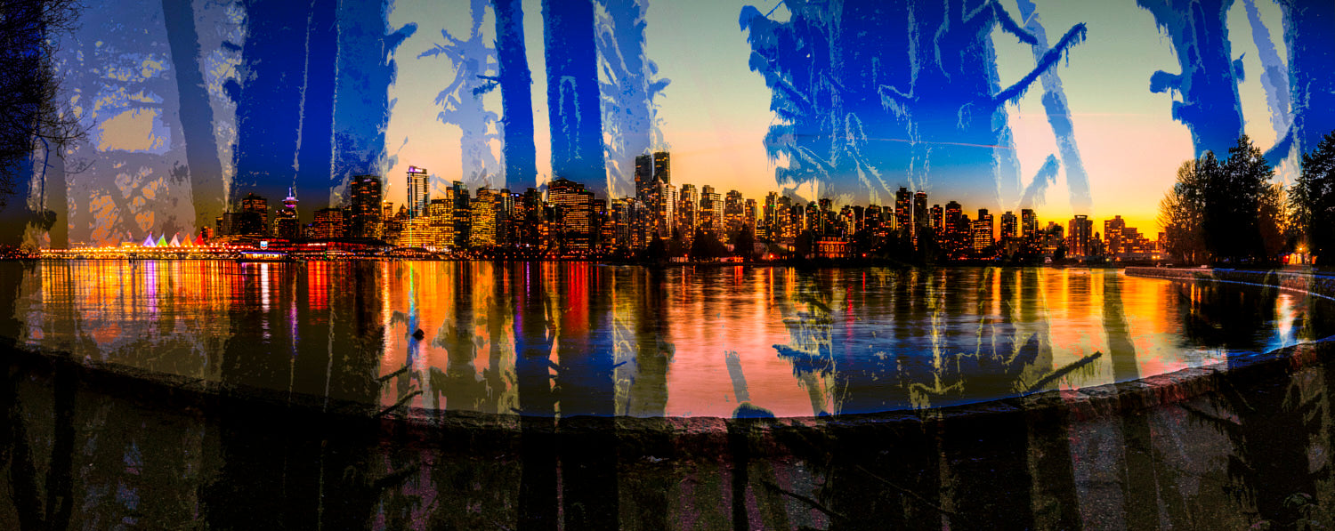 Golden light kisses the skyline while bold brush textures stretch across the horizon. This layered composition blends nature’s quiet strength with urban beauty, offering a vibrant moment suspended between day and night. Calm, bold, and deeply atmospheric.