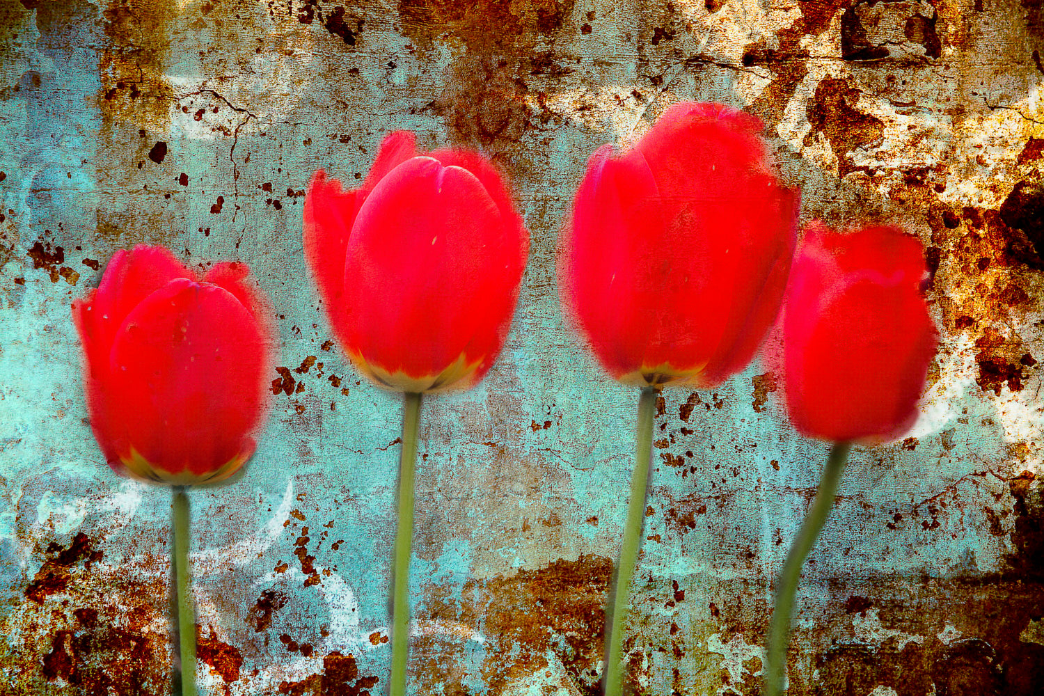 Four vivid red tulips rise against a textured wall of turquoise and rust, blooming defiantly in contrast. The backdrop tells a story of time and wear, while the flowers offer a burst of life and color. It’s a celebration of beauty that thrives where you least expect it.