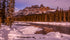 Beneath a pastel winter sky, jagged spires stand in silent watch over a frozen river valley. The snow-blanketed forest whispers of ancient tales, while the amber glow of the mountains captures the fleeting warmth of day.