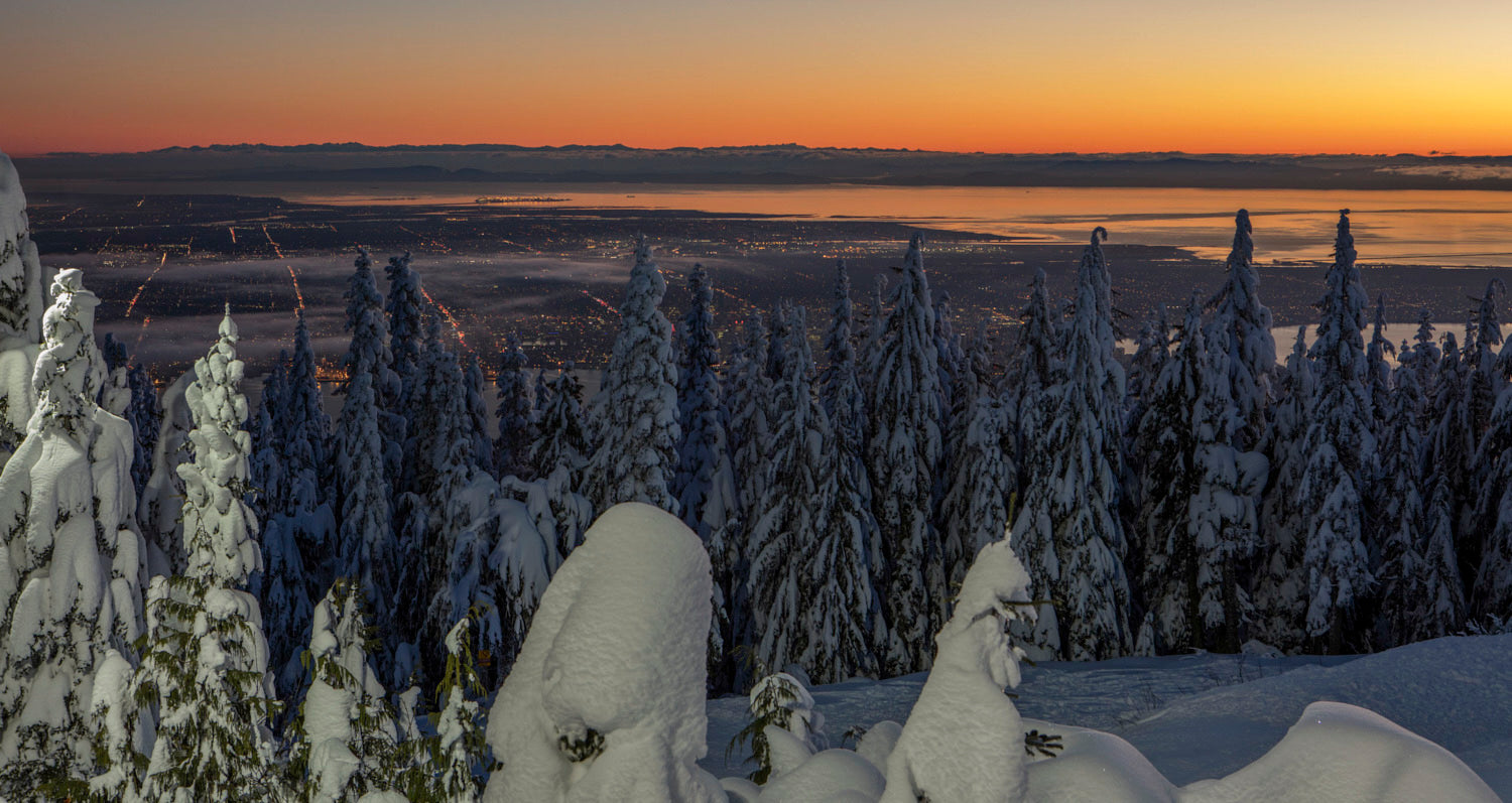 From the silent heights of snow-laden evergreens, the city below glows softly into the horizon. A quiet contrast of nature’s stillness and urban rhythm captured in the first breath of dawn.