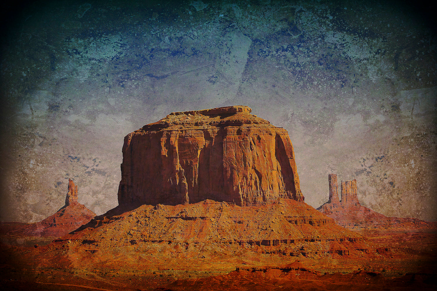 A towering butte rises from the rust-colored desert, framed by a textured sky that whispers of wind and memory. The shadows are deep, the silence vast, and the land feels sacred. This piece channels the ancient stillness of the American Southwest with raw, grounded beauty.