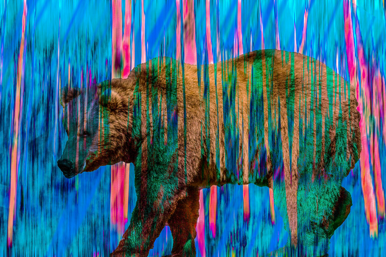 A solitary bear moves with quiet strength through a storm of vivid blues and electric streaks of pink. The contrast between motion and stillness draws you in, offering a sense of mystery, power, and surreal peace in the wild.