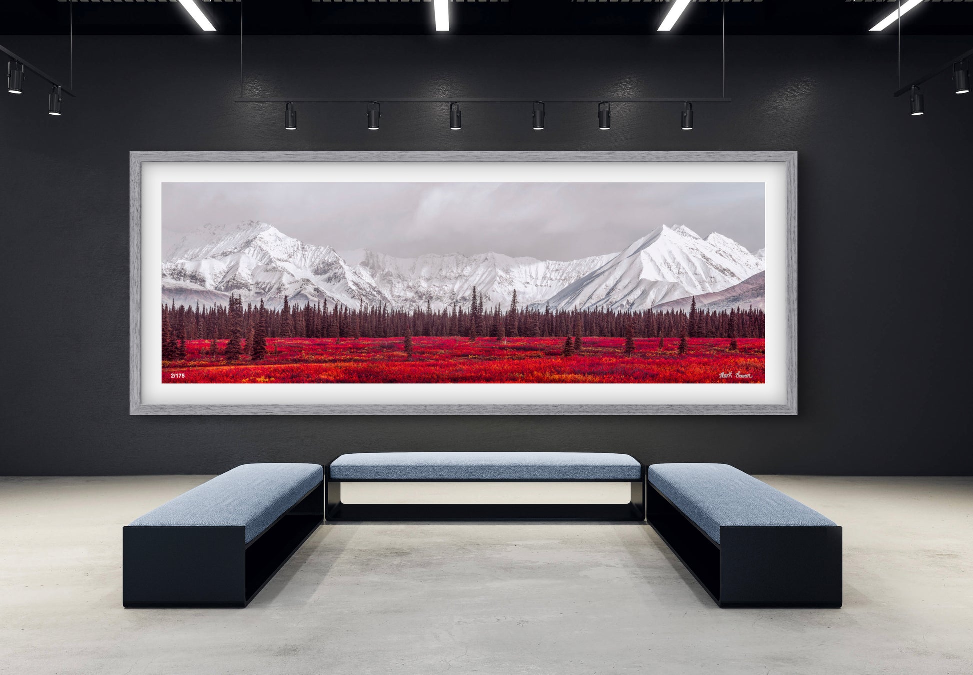 Experience the breathtaking beauty of Denali, where fall and winter collide in a stunning display of nature! The vibrant red shrubs contrast with the majestic snowy peaks, creating a picturesque scene that captures the essence of Alaska's diverse landscape. #landscape #sky #cloud #snow #outdoor #mountain #mountainrange #panorama #nature