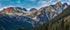 A breathtaking view of rugged mountains bathed in golden sunset light. The dramatic contrast of the sunlit crags against cool shadowed valleys and the rich forest foreground creates a captivating natural scene.