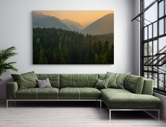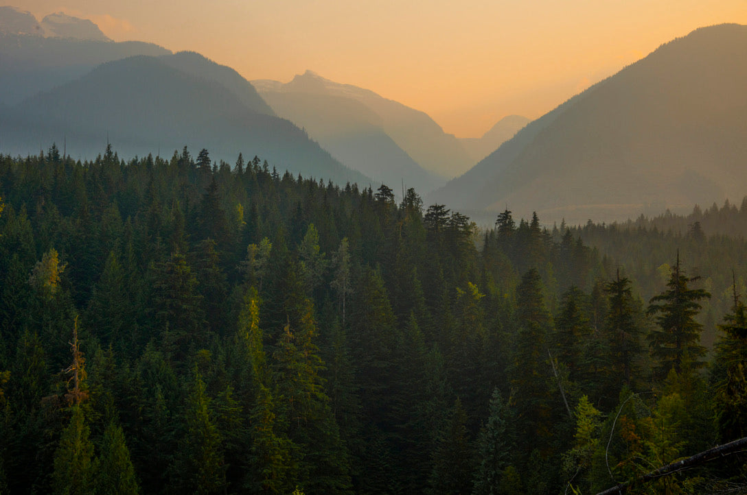 Amidst the majestic mountains and towering trees of BC, a smoky orange fog blankets the landscape, creating an otherworldly atmosphere. Nature's beauty shines even in challenging times. #landscape #outdoor #fog #tree #wilderness #highland #mountainrange #sky #hillstation #hill #mist #sunrise #mountain #nature #sunset”