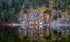 A tranquil scene of a calm forest lake mirroring tall evergreen trees along the shoreline. The soft, warm tones of the late-day light blend with rich greens and browns, offering a peaceful and grounding view for any living space or office.