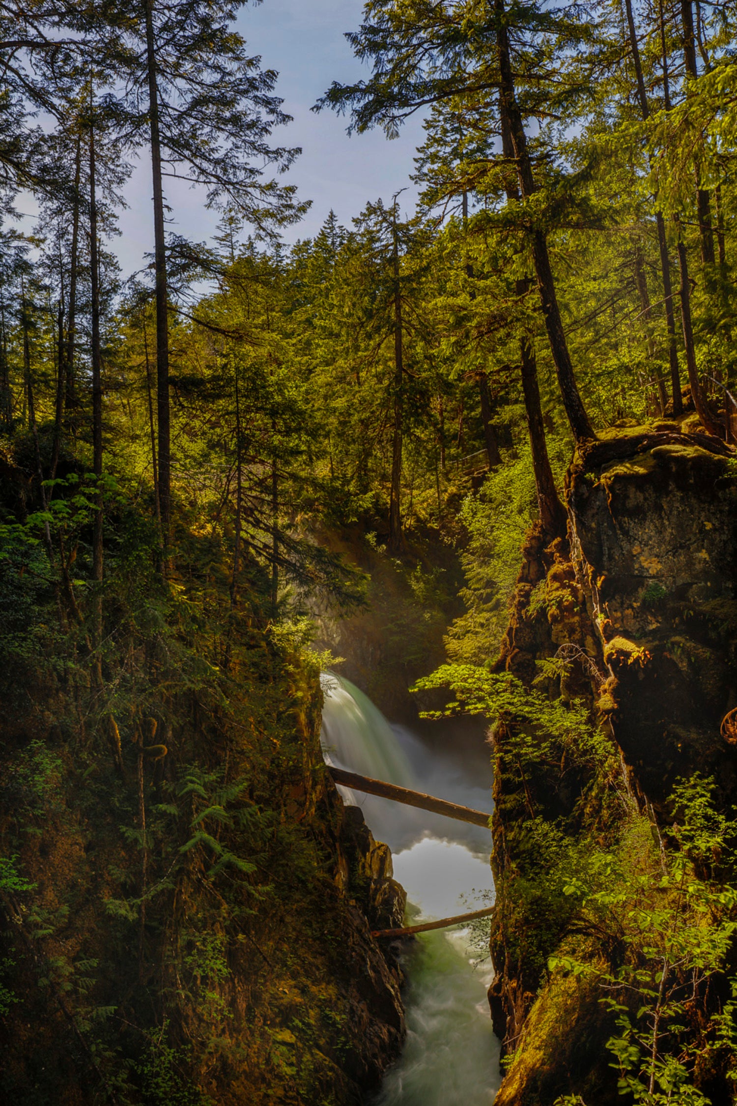 Sunlight streams through tall evergreens, revealing a hidden waterfall deep within the canyon. Nature's own bridges lie quietly across the rushing water, inviting a moment of stillness in the wild.