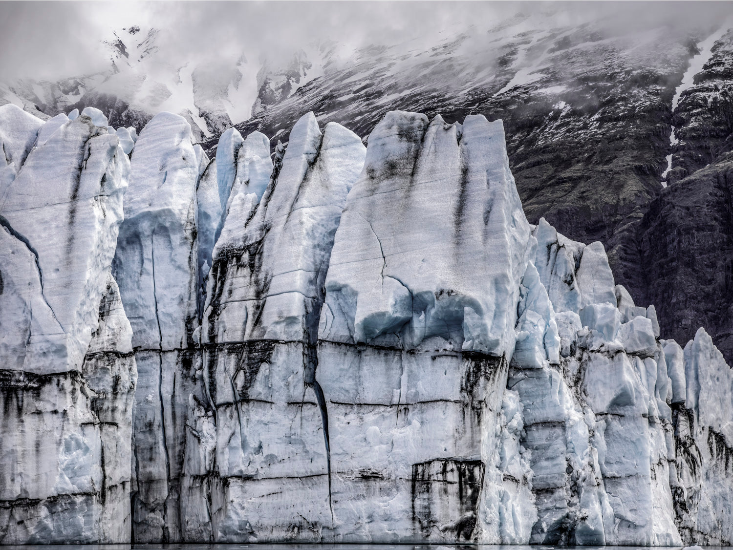 Towering shards of glacial ice stand like ancient fortifications beneath rugged, snow-dusted cliffs. Dark streaks trace the slow movement of ice through time, as mist and shadow weave across the dramatic alpine backdrop.