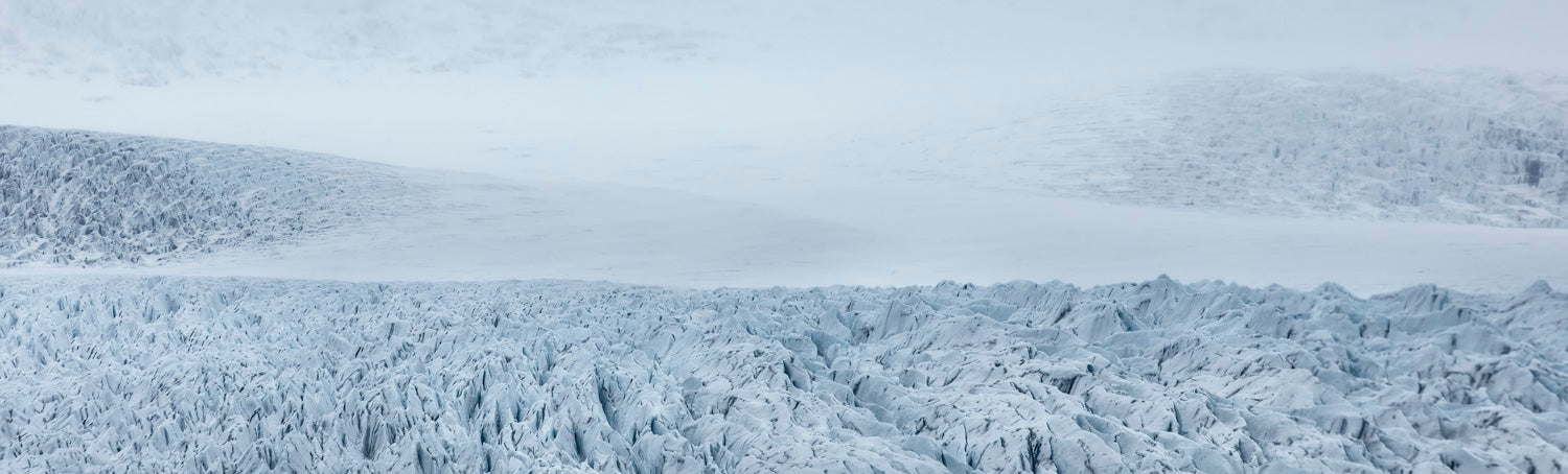 A vast expanse of jagged ice stretches across the landscape, its sharp formations resembling a frozen sea of waves. The muted whites and blues blend into the distant horizon, where snow and mist merge together, creating a stark and breathtaking view of nature’s frozen power.