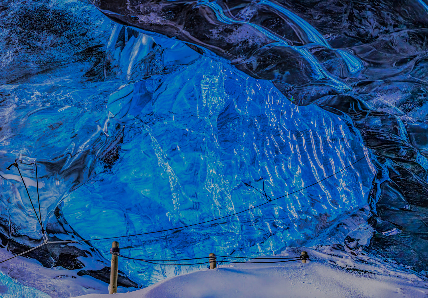 A striking section of glacial ice gleams in vivid blue tones, with dark striations and translucent layers revealing the ancient flow patterns within. Safety ropes in the foreground hint at the human scale of this natural wonder, inviting exploration of the icy depths.