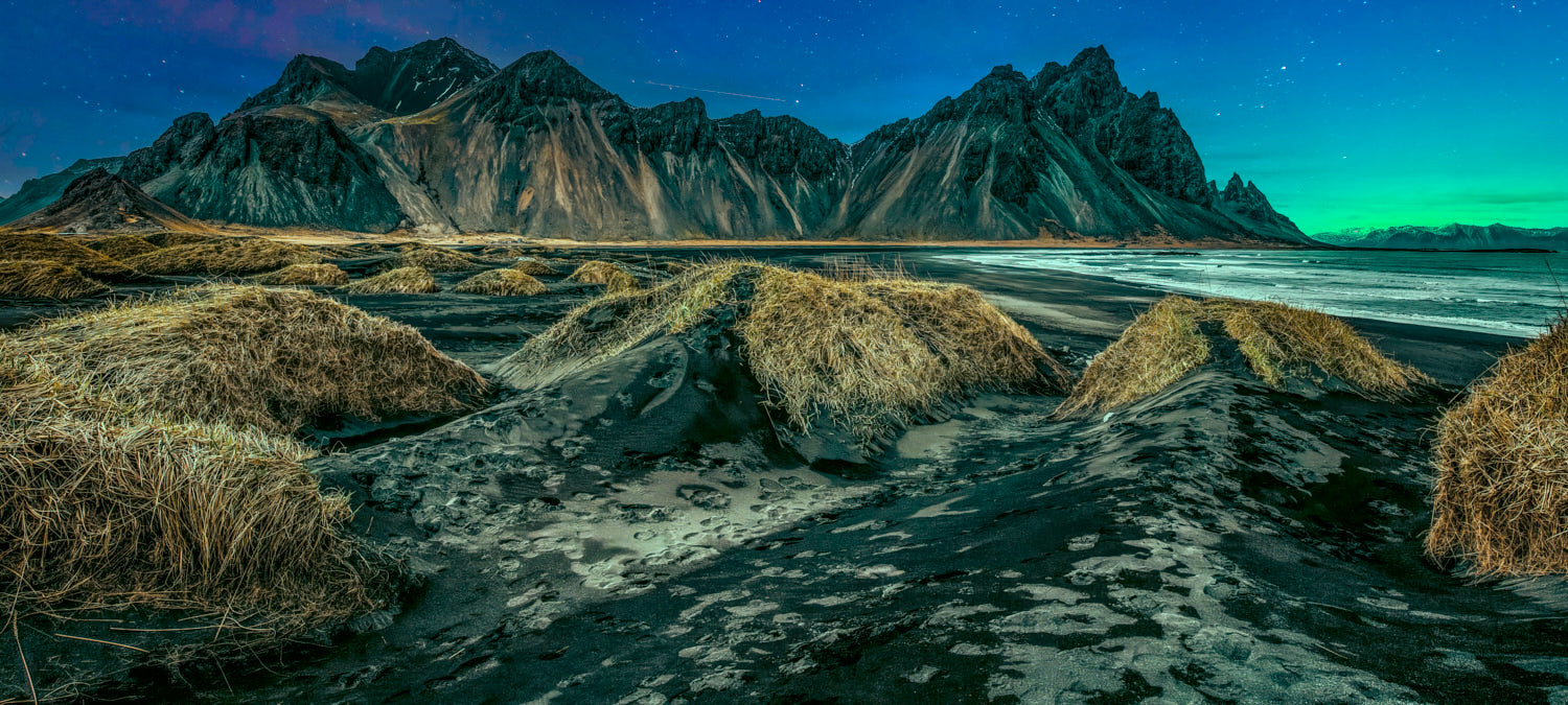 A towering glacial front stretches across calm waters, its icy textures bathed in a cool twilight. Above, a radiant green aurora arcs gracefully across the night sky, blending into deep blue hues scattered with stars. The tranquil scene captures the harmony between earth and sky.