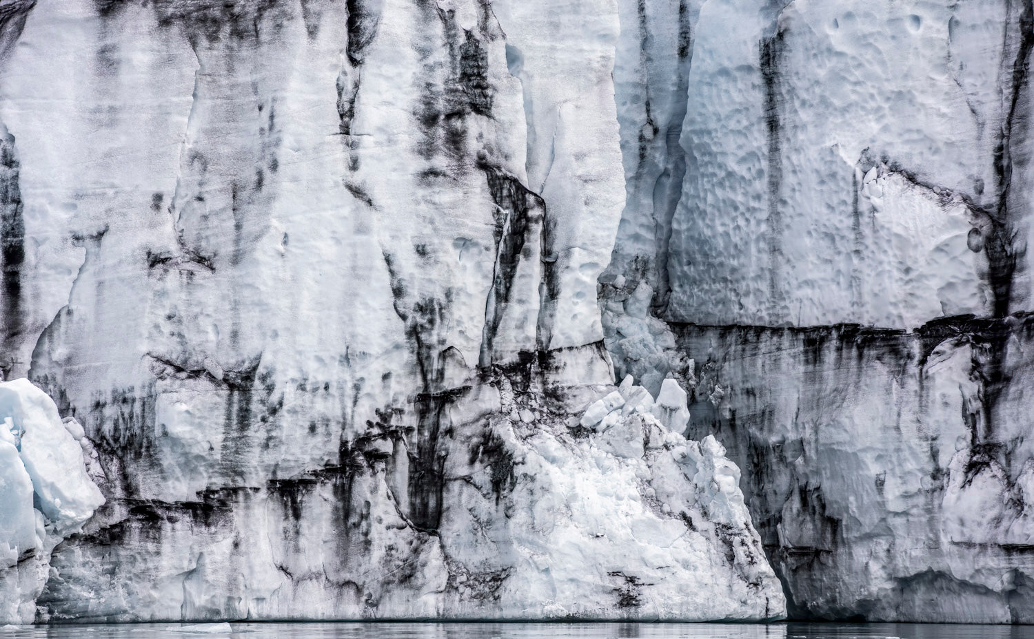 The towering face of a glacier reveals deep vertical striations and layers of compacted ice. Dark streaks trace the passage of debris and sediment through the ancient frozen mass, adding a striking contrast to the crisp, pale surface of the ice wall.