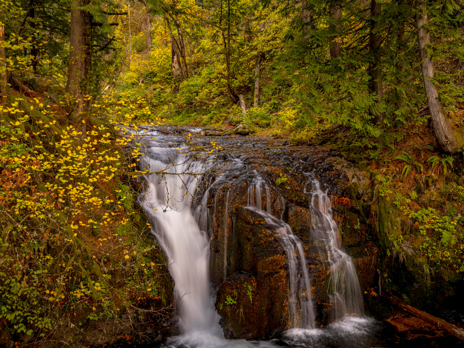 Bathed in the glow of the rising sun, this waterfall spills like liquid light down granite cliffs. Surrounded by evergreens, it dances between shadow and flame—an untamed ribbon cascading through the forest’s waking breath.