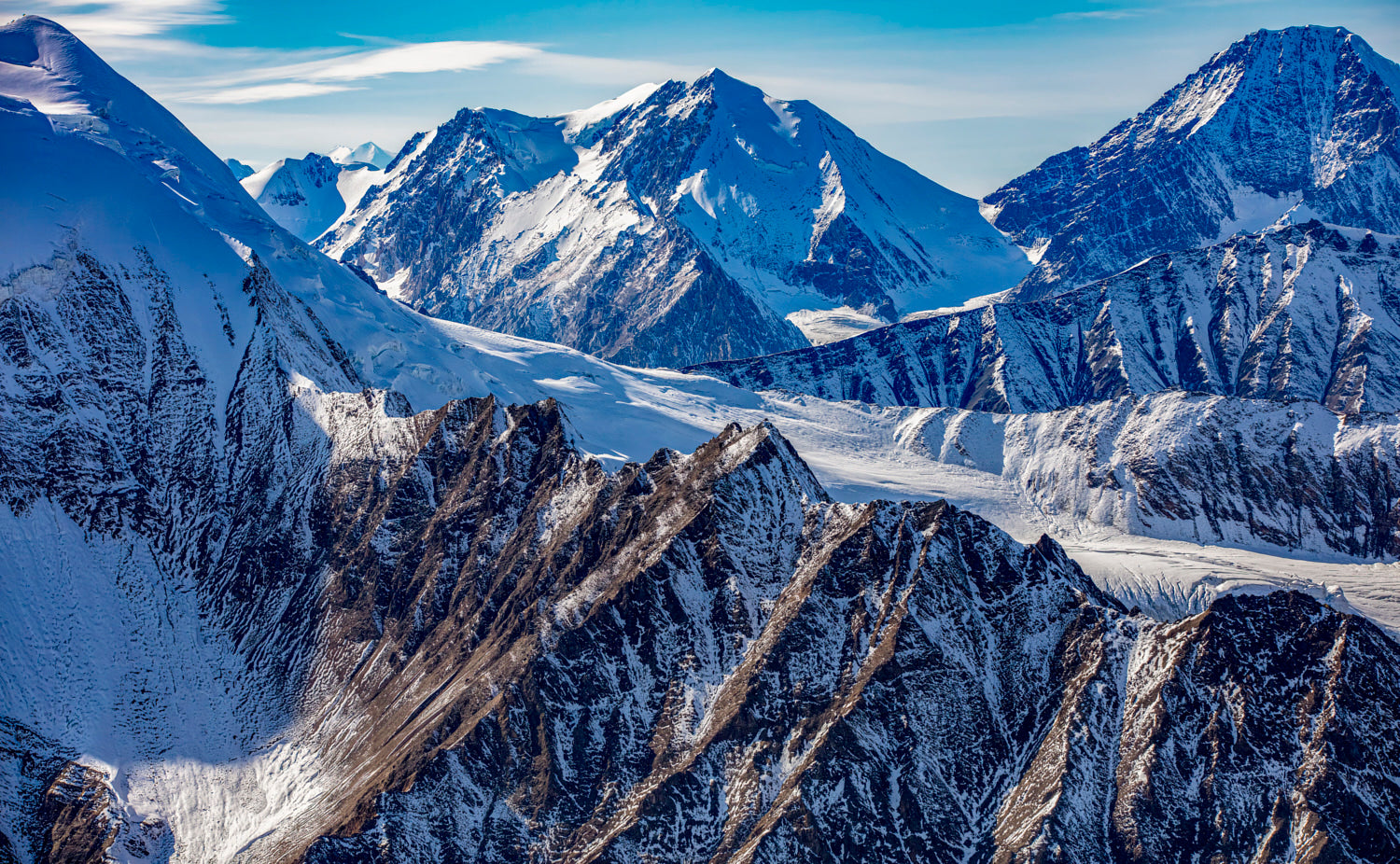 Sawtooth ridges carve their way through a frozen sea of glaciers. Each jagged peak tells an ancient tale, etched in snow and shadow beneath an endless sky.