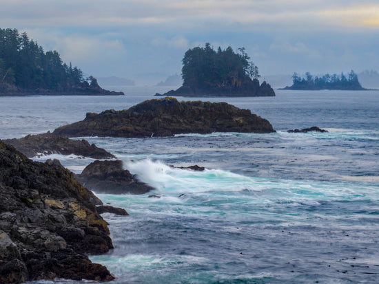 Rugged outcrops rise from restless waves, their steadfast forms shaping the flow of the sea. Distant islets emerge from the mist, sentinels watching over a coastline where water, wind, and stone meet in timeless rhythm.
