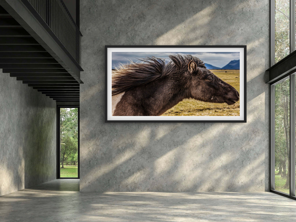 A striking close-up of an Icelandic horse with its mane flowing in the wind. The powerful profile and rugged texture of its coat reflect the breed’s strength and resilience, set against a backdrop of open fields and distant mountains.