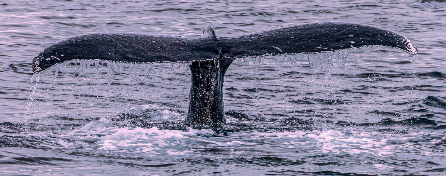 A stunning view of a humpback whale's tail emerging from the ocean, with streams of water falling gracefully from its edges. The soft purplish tones of the sea create a calm and magical atmosphere, ideal for bringing a touch of marine beauty into any setting.