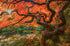 A captivating image of a Japanese maple tree with deeply textured, twisting branches and vibrant autumn foliage. The sun peeks through the fiery red and orange leaves, casting a warm glow over the tranquil garden pond below. An inspiring and serene piece for any living space.