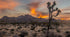 A beautiful capture of a lone Joshua tree standing tall in the desert, with rugged mountains in the background and a vivid sunset sky painted in warm hues. The serene and expansive scene makes for a striking addition to any home or office decor.