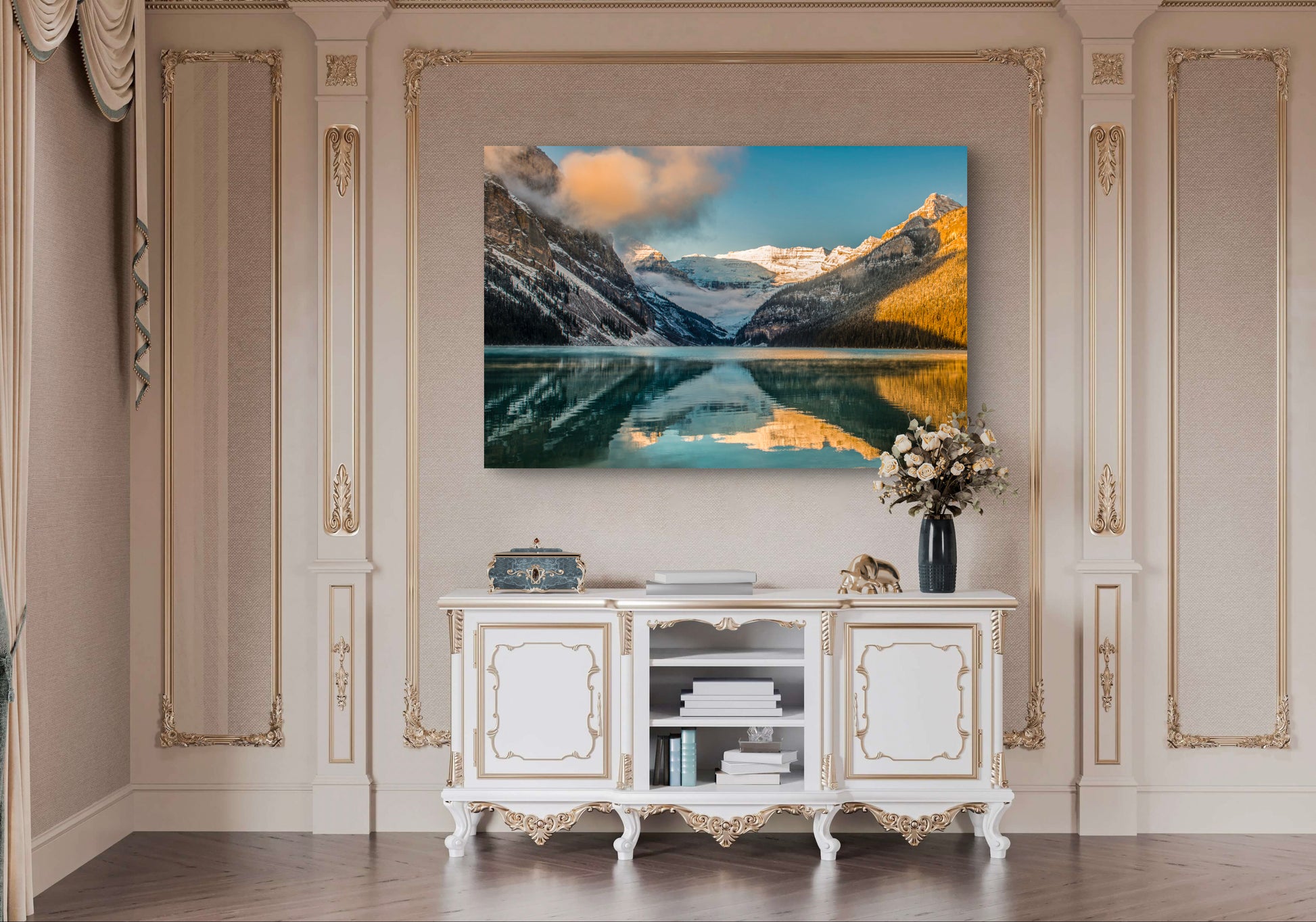 The mountains stand guard, their peaks kissed by the dawn's embrace. Lake Louise mirrors their grandeur, a canvas of tranquility.