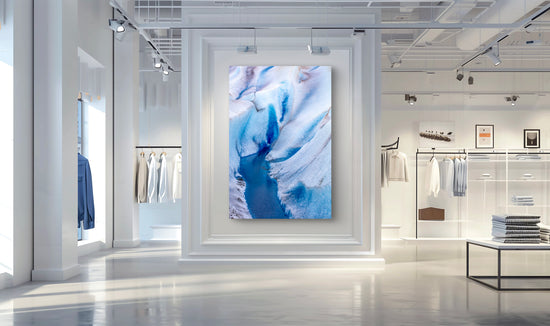 A sweeping aerial view of a glacier winding through rugged mountain terrain, its dark moraines creating striking patterns across the ice. The glacier terminates in a serene, milky-blue glacial lake, framed by towering peaks under a crisp, clear sky.