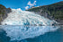 A powerful glacier descends from rugged green and rocky slopes into an icy blue bay, its brilliant, textured ice reflected in the calm water. The floating ice chunks and clear sky complete this striking natural scene.