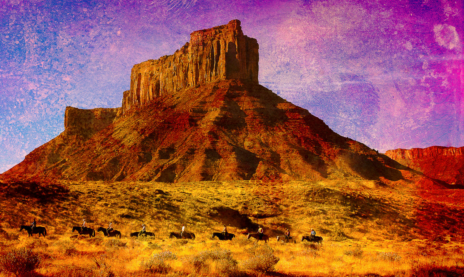 A golden mesa towers beneath a sky washed in lavender and rose as a line of riders moves through the glowing terrain below. This piece captures the timeless spirit of the American West, blending bold landscape with the quiet rhythm of a journey. Warm, wild, and full of story.