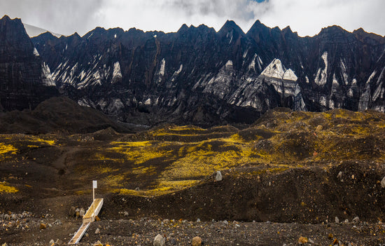 A stark volcanic landscape unfolds beneath jagged black peaks dusted with patches of snow. The valley is streaked with yellow moss, adding a surreal contrast against the dark, ash-laden earth. A lone wooden path leads toward the mountains under an overcast sky, creating an atmosphere of mystery and raw natural beauty.