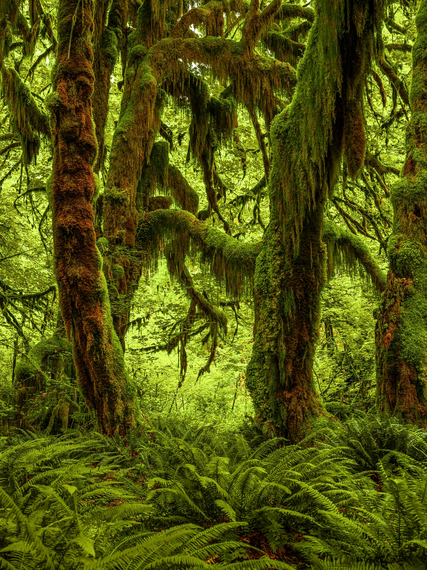 A lush and enchanting forest scene with towering moss-covered trees and a dense carpet of vibrant green ferns. The intricate textures and rich tones create a sense of calm and wonder, perfect for bringing a touch of nature’s tranquility into any space.