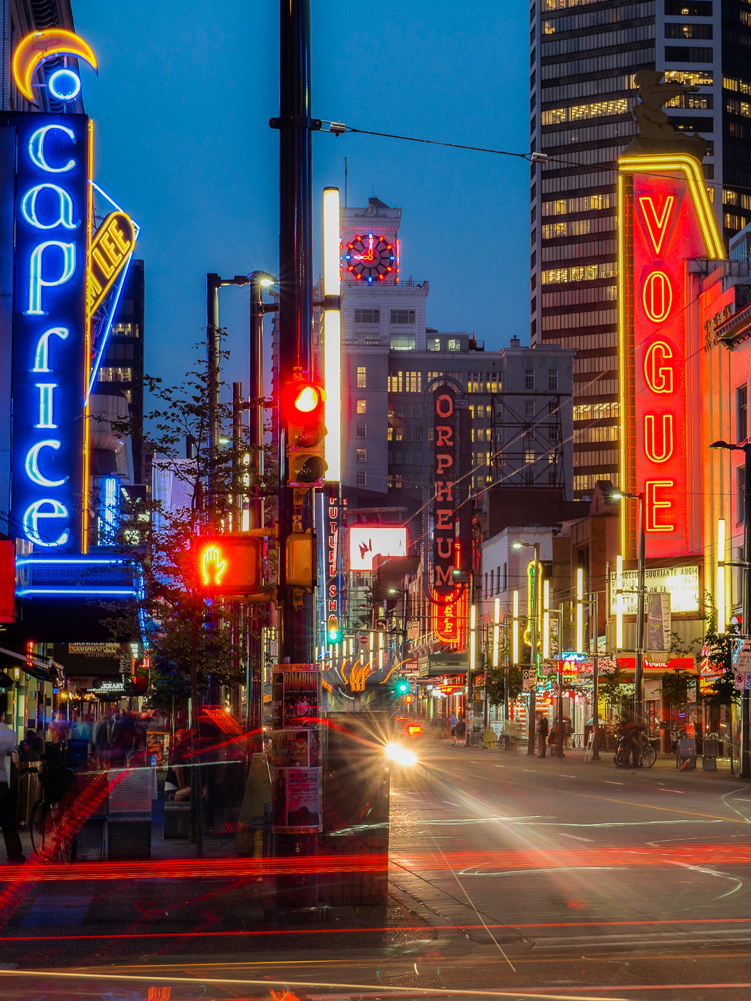 The city comes alive in glowing color as neon signs light up Granville Street. Caprice, Orpheum, and Vogue stand tall in a row of electric nostalgia, while car lights blur into motion. It’s the heartbeat of nightlife captured in one vivid frame.