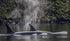A serene scene of two orcas surfacing side by side, releasing soft misty sprays into the calm reflective waters. The lush green forest backdrop adds to the peaceful and natural feel, perfect for enhancing any marine or nature themed space.