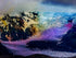 A glacier spills between shadowed peaks, its icy surface brushed with an unexpected wash of color. Blues melt into purples, greens, and soft rose, turning frozen terrain into a living canvas. A breathtaking moment where nature and light quietly collide.