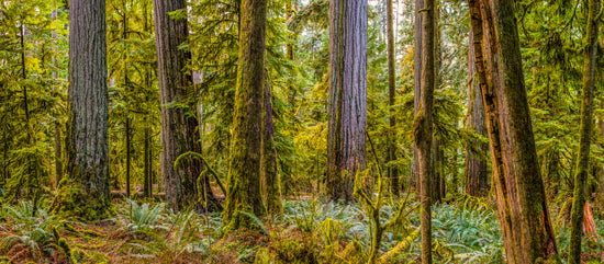 A lush redwood forest scene featuring towering ancient trees surrounded by moss-covered trunks and dense ferns. The vibrant green hues and natural textures make this a perfect nature-inspired wall art for creating a calming woodland atmosphere.