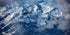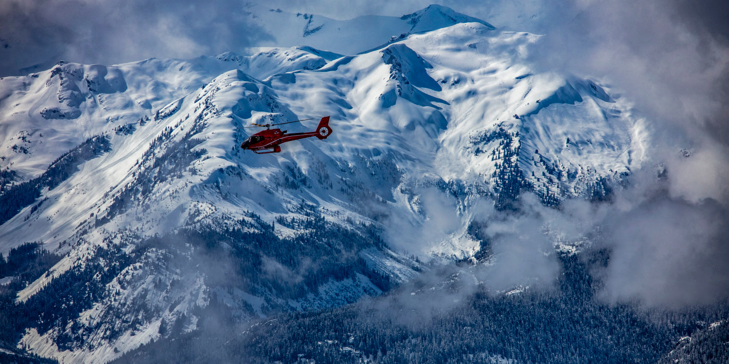 A striking red rescue helicopter soars across a dramatic landscape of towering snow-blanketed peaks. Wisps of clouds drift between jagged ridgelines, while deep shadows and brilliant white slopes highlight the vastness of the alpine terrain. The image captures a moment of precision and courage in the heart of an unforgiving winter wilderness.