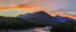 A glowing stream winds through dark pine as twilight paints the peaks in soft amber. Quiet. Wild. Timeless.