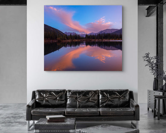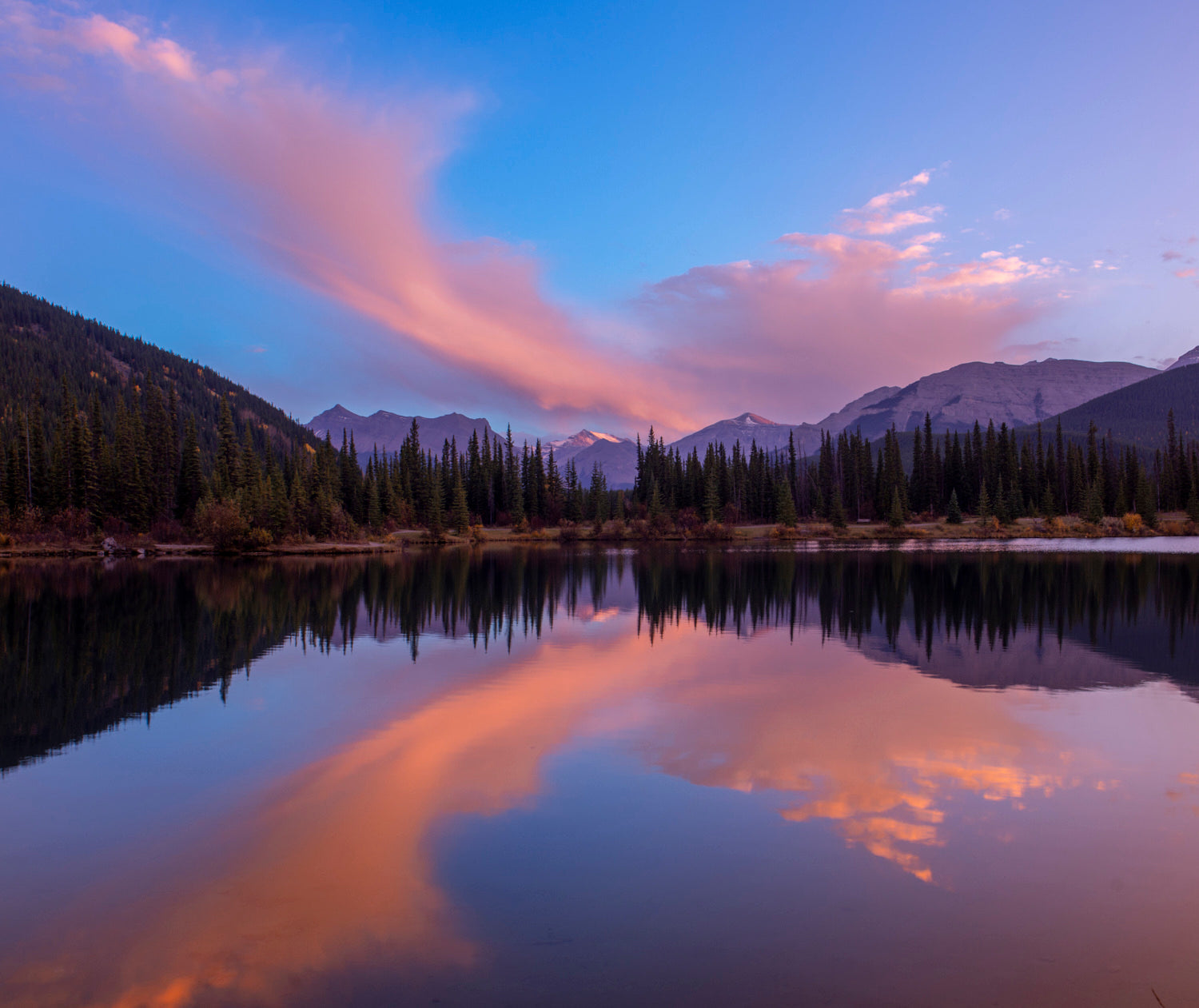 As the sun sets behind the mountains, the sky transforms into a canvas of soft hues, perfectly mirrored in the tranquil waters below