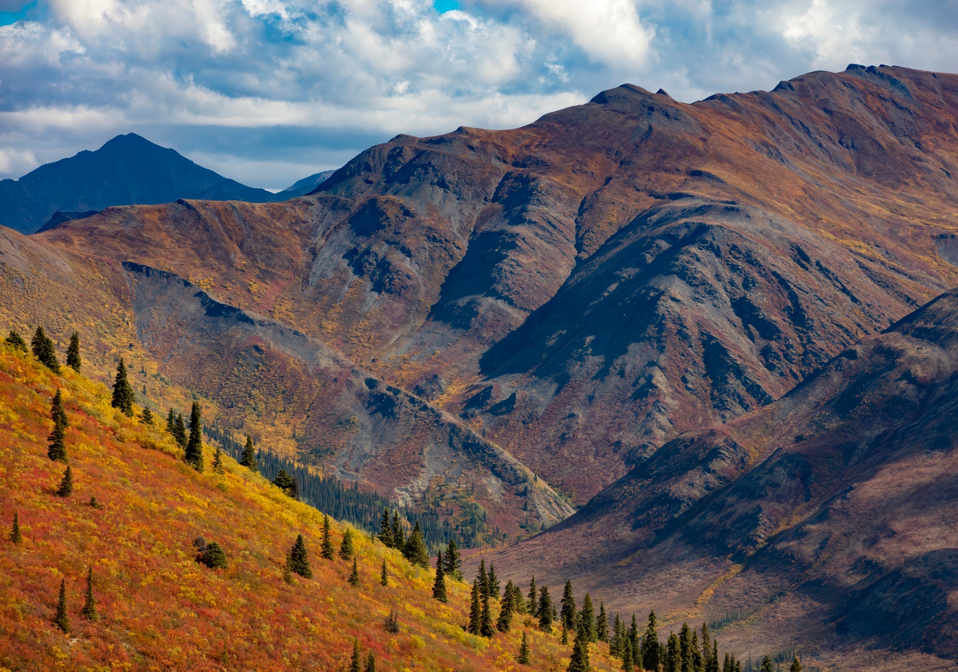 Rolling mountains stretch beneath a bright sky, their rocky slopes softened by autumn’s warm hues of gold, rust, and green. Scattered evergreens climb the ridges, adding contrast to the textured terrain. A vivid snapshot of nature’s seasonal beauty in a wild, untamed landscape.
