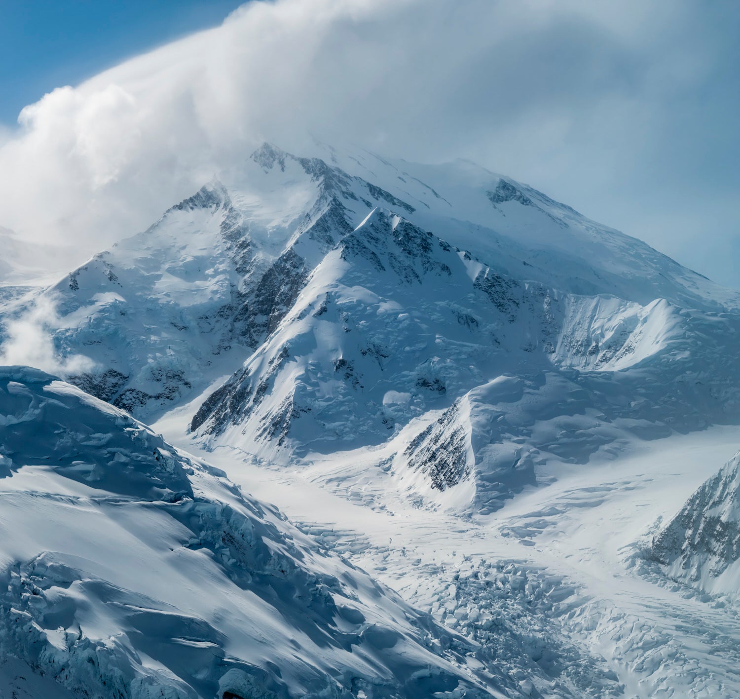 An awe-inspiring view of snow-draped alpine peaks veiled in swirling clouds, with steep ridges and glacial valleys carved by ancient ice. The untouched, icy landscape conveys the raw power and serenity of nature at its most extreme.