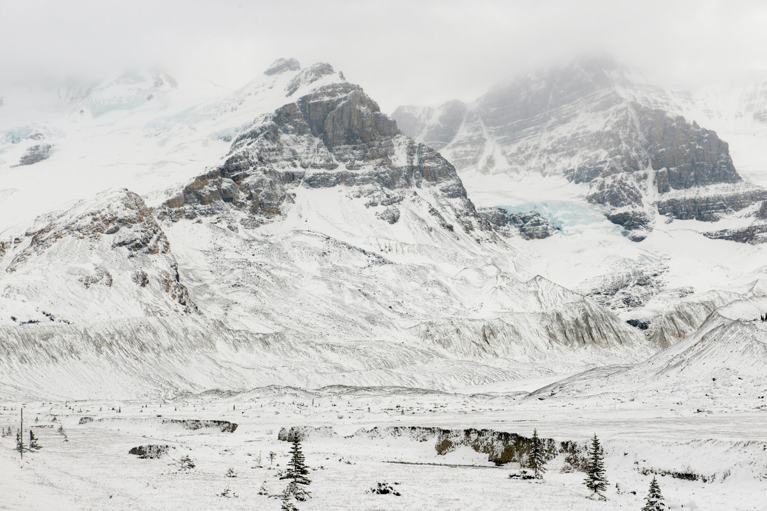An expansive view of towering mountains cloaked in thick snow, their rugged faces softened by swirling mists and low-hanging clouds. The landscape is serene yet formidable, with only a few hardy evergreens dotting the frozen terrain below. The muted tones and delicate lighting evoke the raw, quiet beauty of winter in the high alpine.