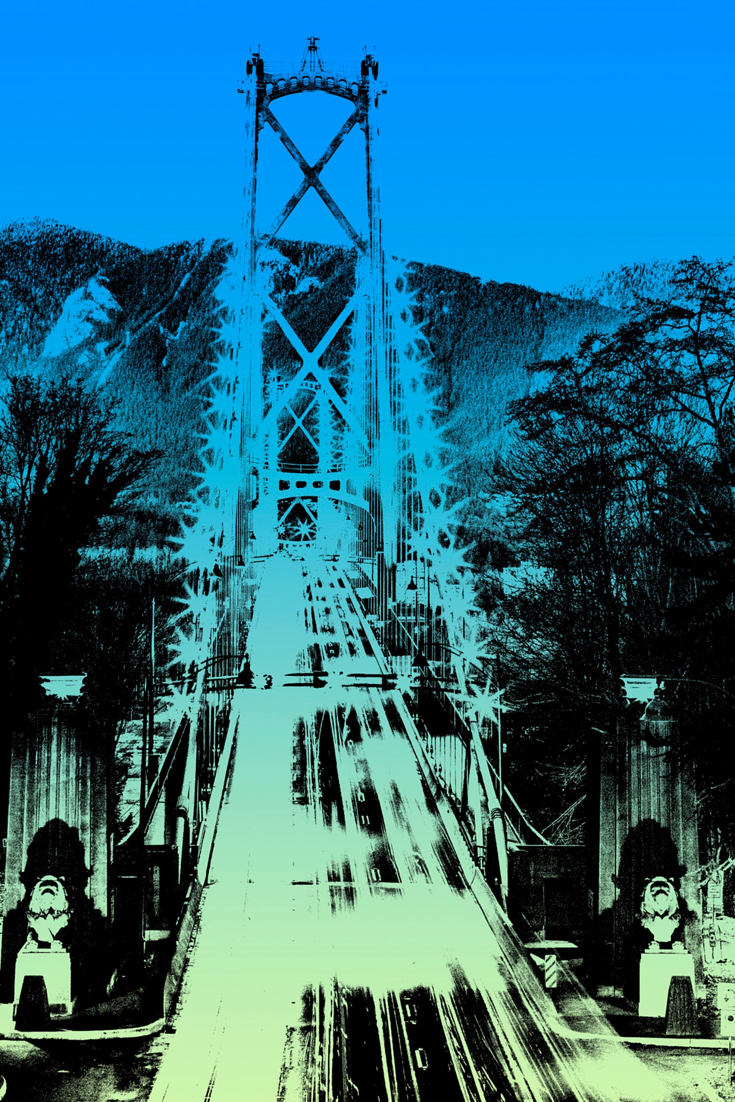 A bold take on Vancouver’s iconic Lions Gate Bridge, captured in icy tones and dynamic light. The towering structure cuts through mountain shadows and a deepening sky, evoking momentum, strength, and the quiet pull of the road ahead.