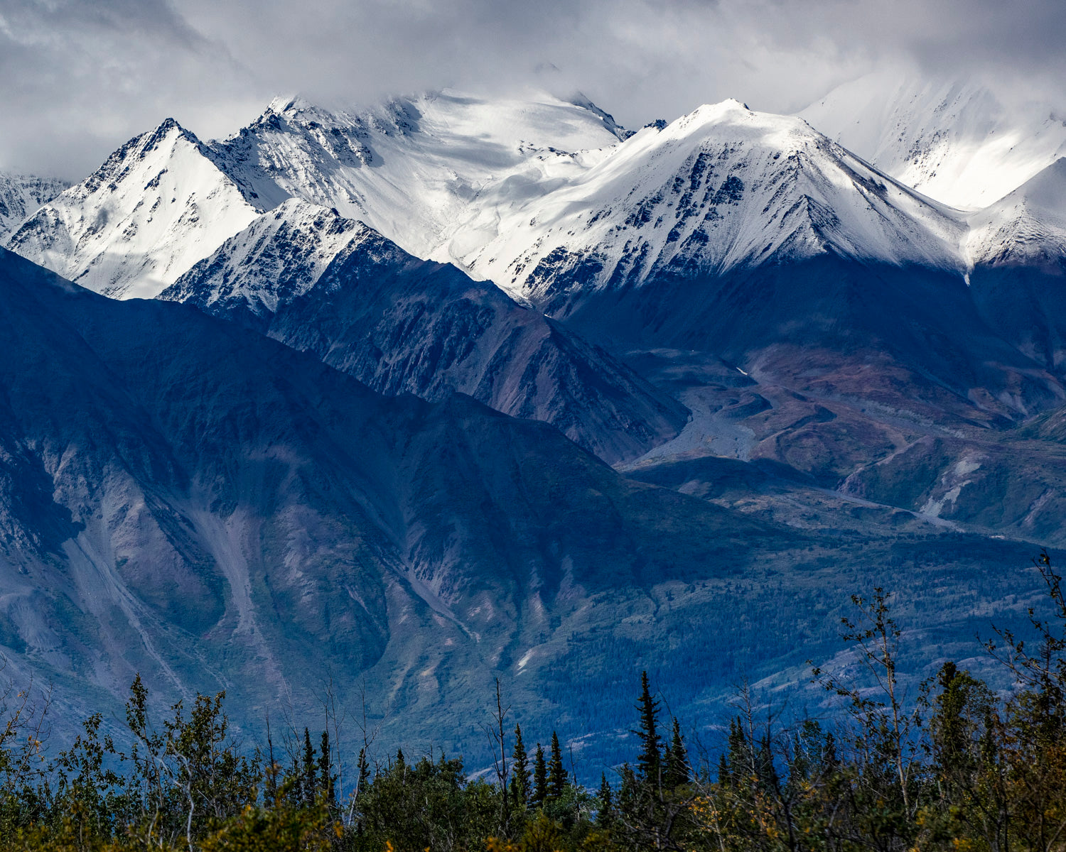 Snow-draped mountain summits rise through brooding clouds while dark, rugged slopes below hint at the raw power of nature. The scene transitions from the alpine heights to the rolling, forested foothills, all under a shifting sky.