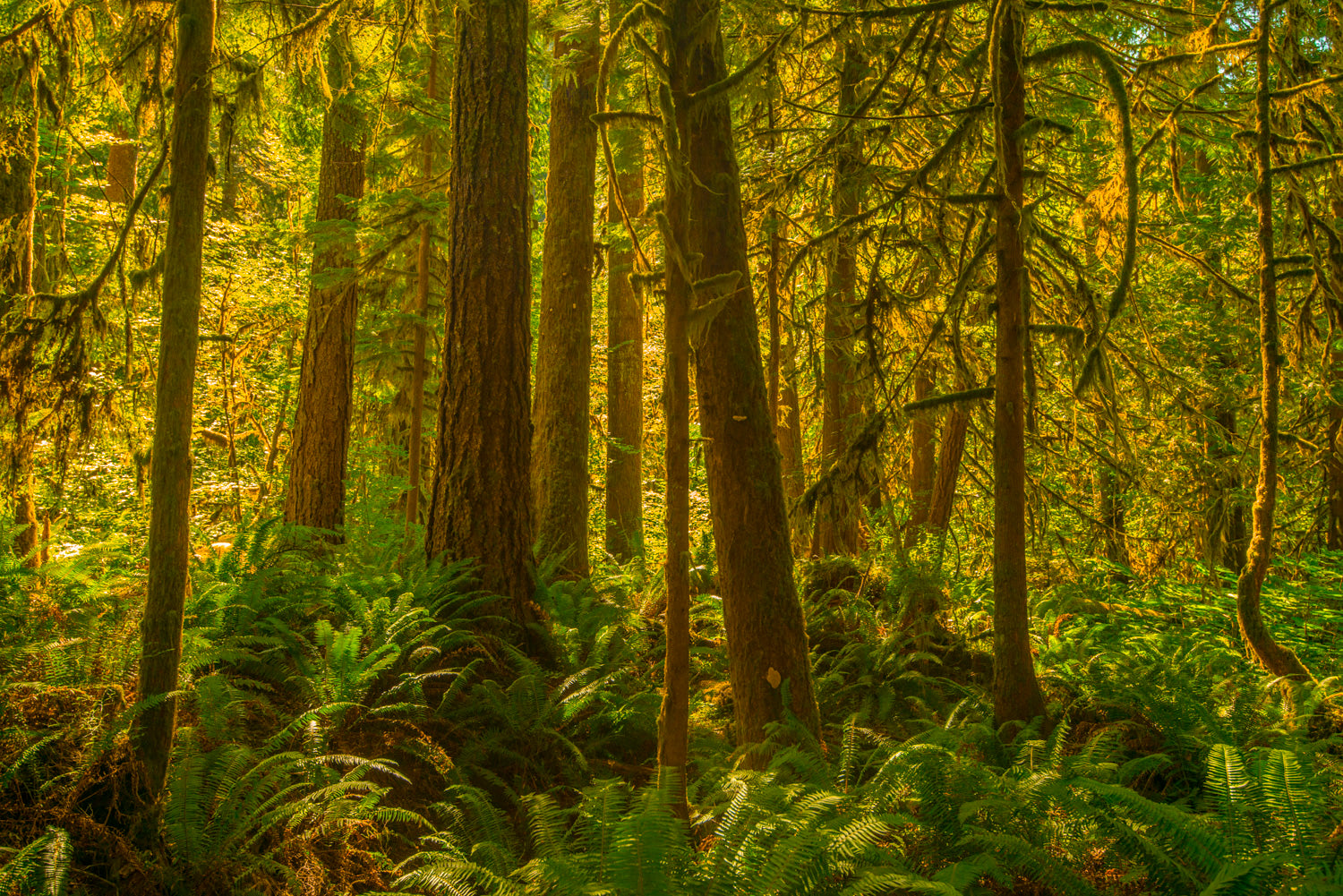 A serene forest scene with tall trees bathed in soft golden sunlight, their trunks rising above a vibrant carpet of ferns. The warm glow and rich textures create a peaceful, inviting atmosphere perfect for bringing the beauty of nature into your living or work space.
