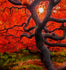 An enchanting Japanese maple tree with dramatic twisting branches illuminated by the sun’s rays. The fiery red foliage creates a captivating contrast with the dark textured bark, making this a perfect nature wall print for seasonal decor or a standout piece for art and photography enthusiasts.