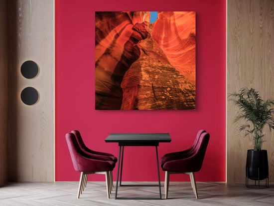 A striking panorama of Red Rock Canyon at sunrise, with rugged sandstone cliffs painted in vibrant hues of orange and crimson. The soft morning light enhances the dramatic textures of the rocky landscape, while scattered clouds drift across a pastel sky, creating a captivating and majestic desert scene.