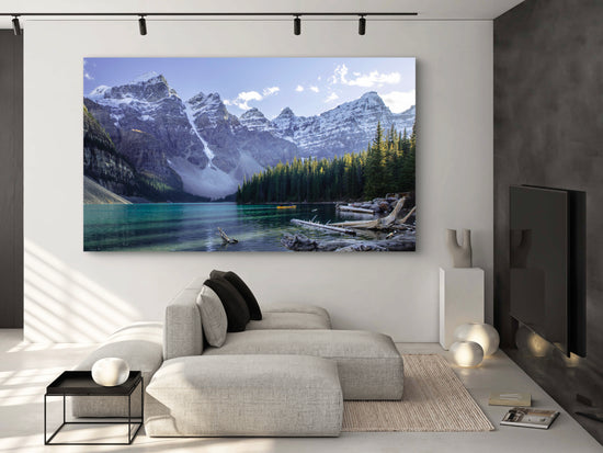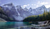 Towering snow-capped peaks glow in early morning light, mirrored perfectly on the glassy surface of Moraine Lake. Radiant streaks of clouds enhance the dramatic alpine atmosphere of this tranquil mountain vista.