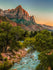 A captivating view of vibrant sandstone cliffs bathed in warm sunset light, rising dramatically above a winding turquoise river. Framed by lush green trees and rugged terrain, this landscape showcases the vivid contrasts and timeless beauty of the canyon environment.